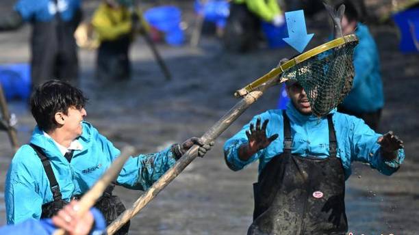 浙江杭州西溪湿地上演干塘捕鱼 渔趣年味吸引中外游人
